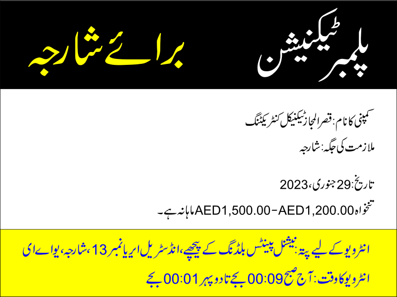 Company Name: Qasr Al Majaz Technical contracting Job Location: Sharjah Experience: AED 1400 per month Date: 29th Jan, 2023 Salary is AED1,200.00 – AED1,500.00 monthly Address for Interview: Behind National paints building, Industrial area # 13, Sharjah, UAE Interview Time: 09:00am – 01:00pm |